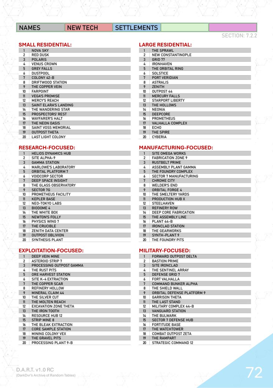 - Names: for creatures (domesticated, pets, alien, monsters), settlements (by category and type), countries, large regions, stellar sectors. Large Faction name generator. Star names. Other stuff.
