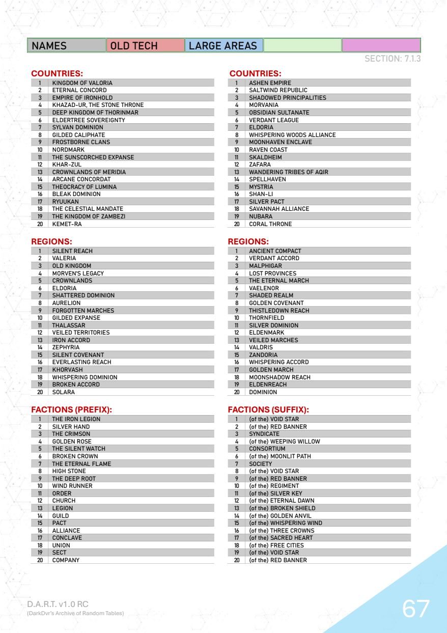 - Name generator tables use the format of prefix + suffix, which gives 400 possibilities (some name tables have 1600 possibilities).